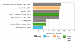 ‘In the motorway fuel tests, Which? found that the fuel economy for diesel vehicles was, on average, 41.5mpg, hybrids 37.2 mog and petrols were less efficient at 36.8mpg’ Petrol, Diesel or Hybrid?
